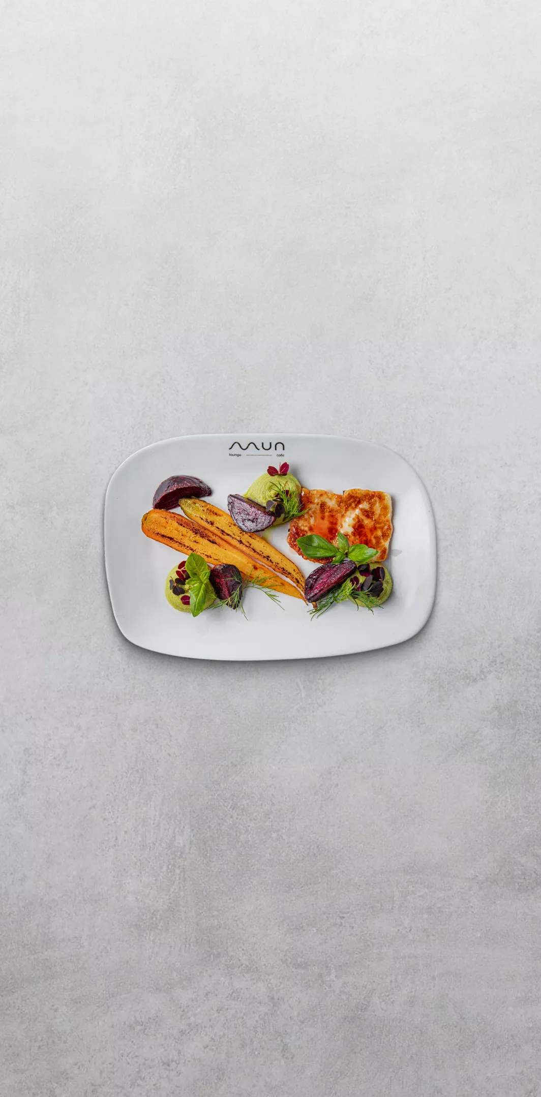Запечённые овощи с хумусом из горошка, соусом наршараб и сыром халуми